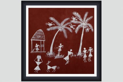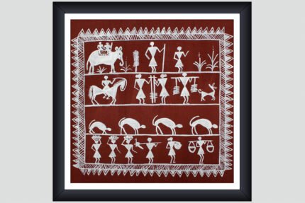 The Farmer theme among the Adivasi Paintings is characterized by rudimentary symbols and graphic vocabulary. This fascinating piece of painting depicts elements of tribal life, tracing its legacy to thousands of years ago.